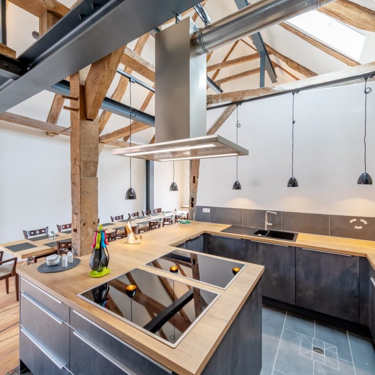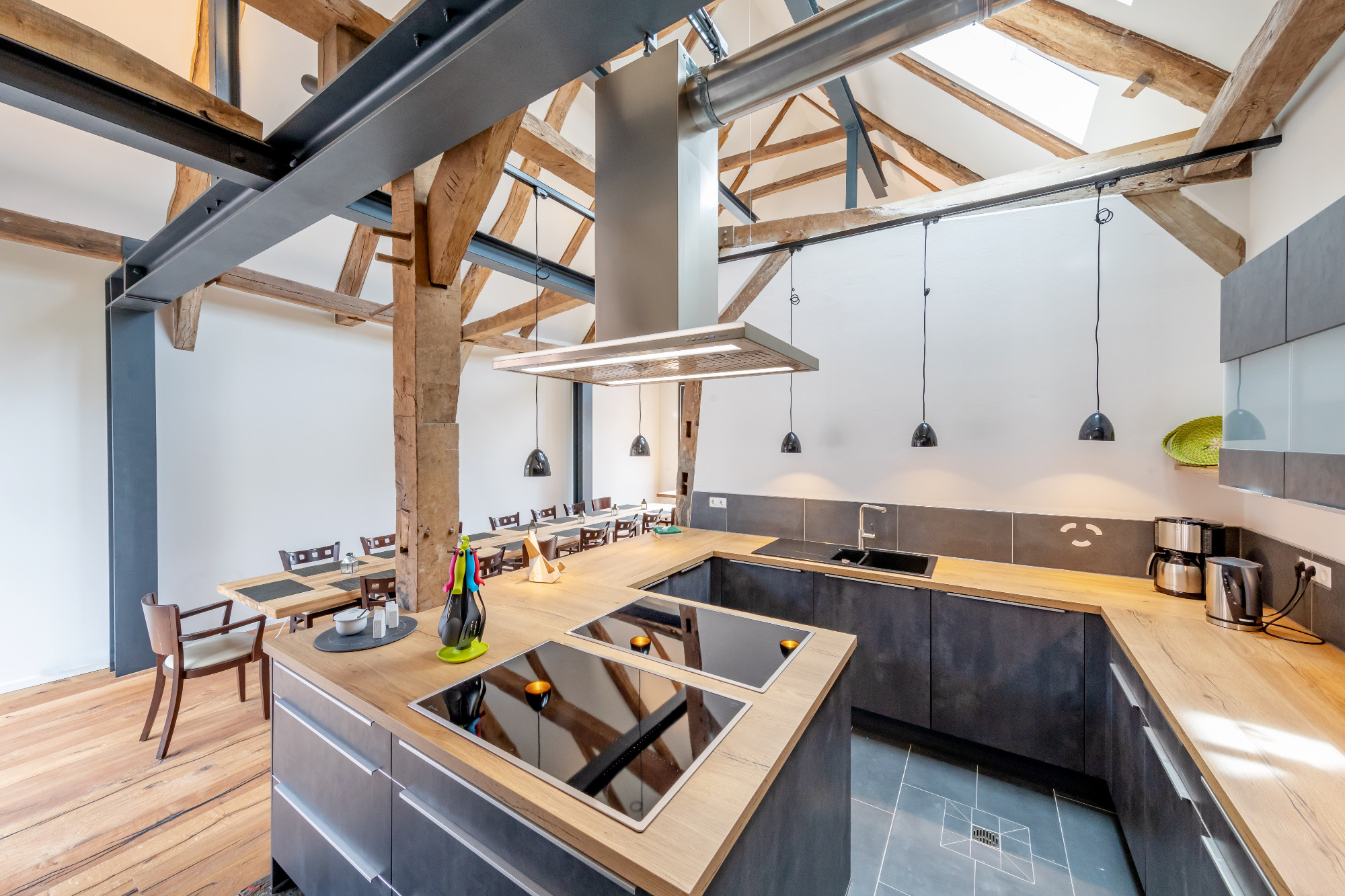 Sie fasst rund 25 Gäste an einer langen Tafel und ist mit einer modernen Luxus-Einbauküche ausgestattet. Für Übernachtungen stehen Ihnen auf Wunsch auch die Ferienwohnungen im angrenzenden Gästehaus zur Verfügung. Mieten Sie einfach das ganze Haus mit der Scheune für ein perfektes Wochenende oder länger.